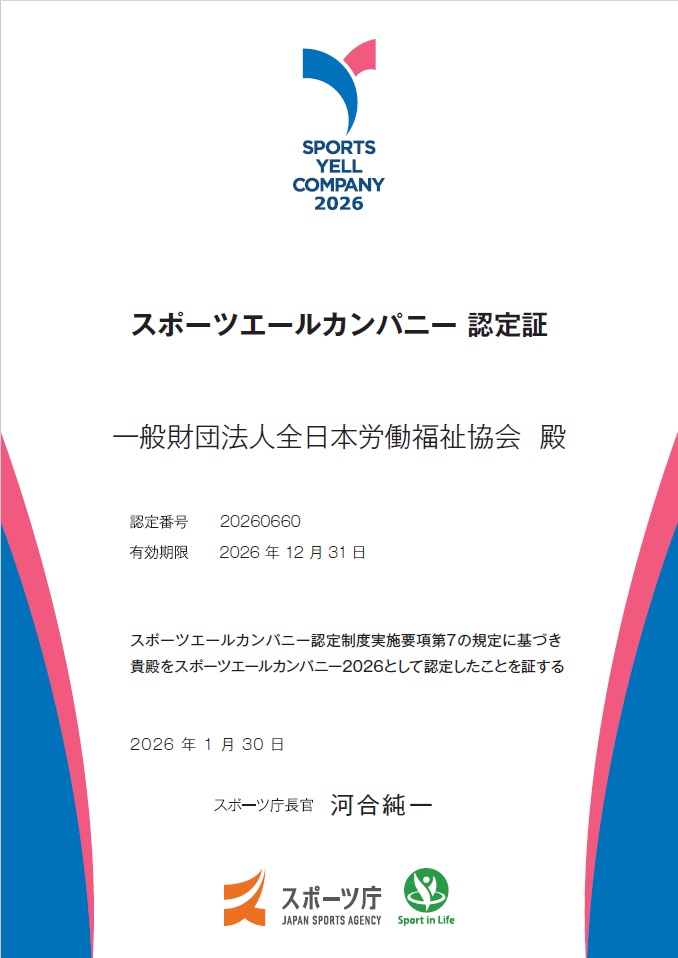 2026.02.19 一 般 「スポーツエールカンパニー2026」に認定されました。 当協会は、職員の健康増進のためにスポーツ活動の促進に積極的に取り組む企業として、スポーツ庁より「スポーツエールカンパニー2026」に認定されました。「スポーツエールカンパニー」制度は、スポーツ庁が「働き盛り世代」のスポーツ実施を促進し、スポーツに対する社会的機運の醸成を図ることを目的として2017年から実施しているものです。